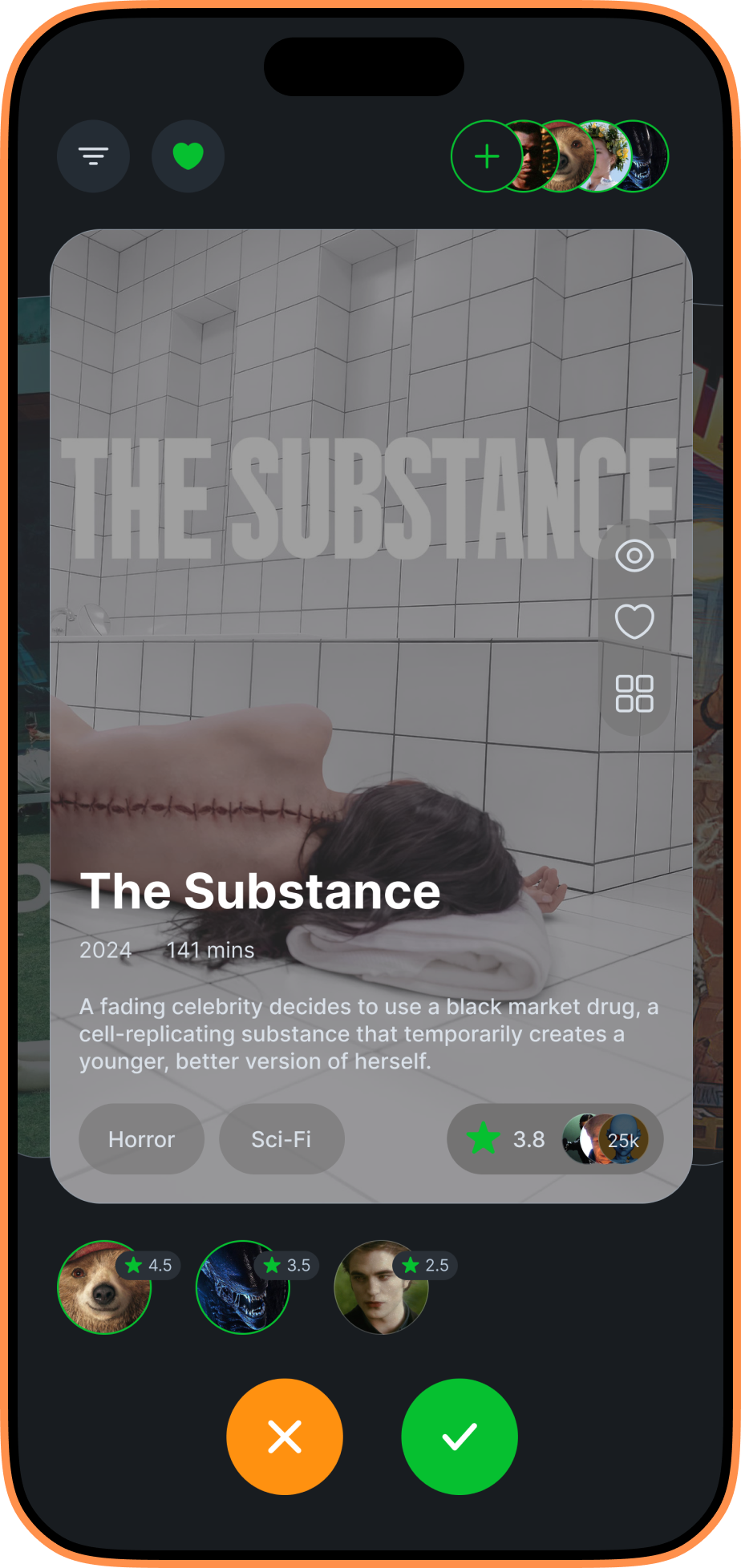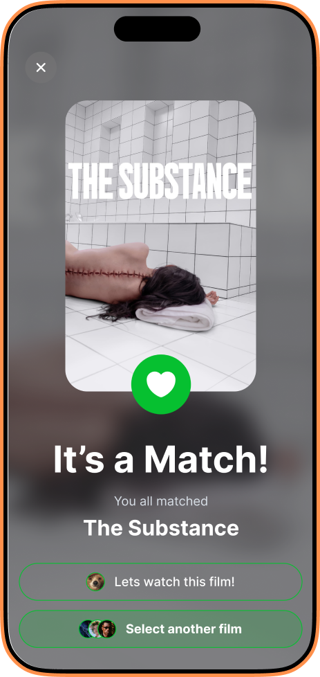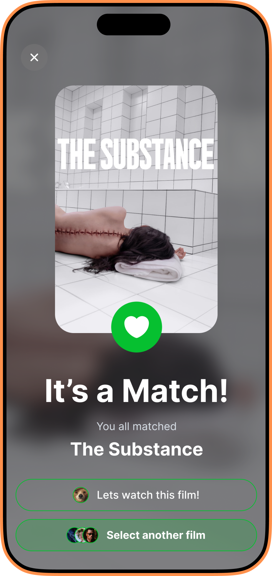 Users respond with a simple "yes" or "no" interaction. Once a unanimous “yes” is received from all members, the Matched Panel appears with options to either proceed with watching or continue swiping for a new film.