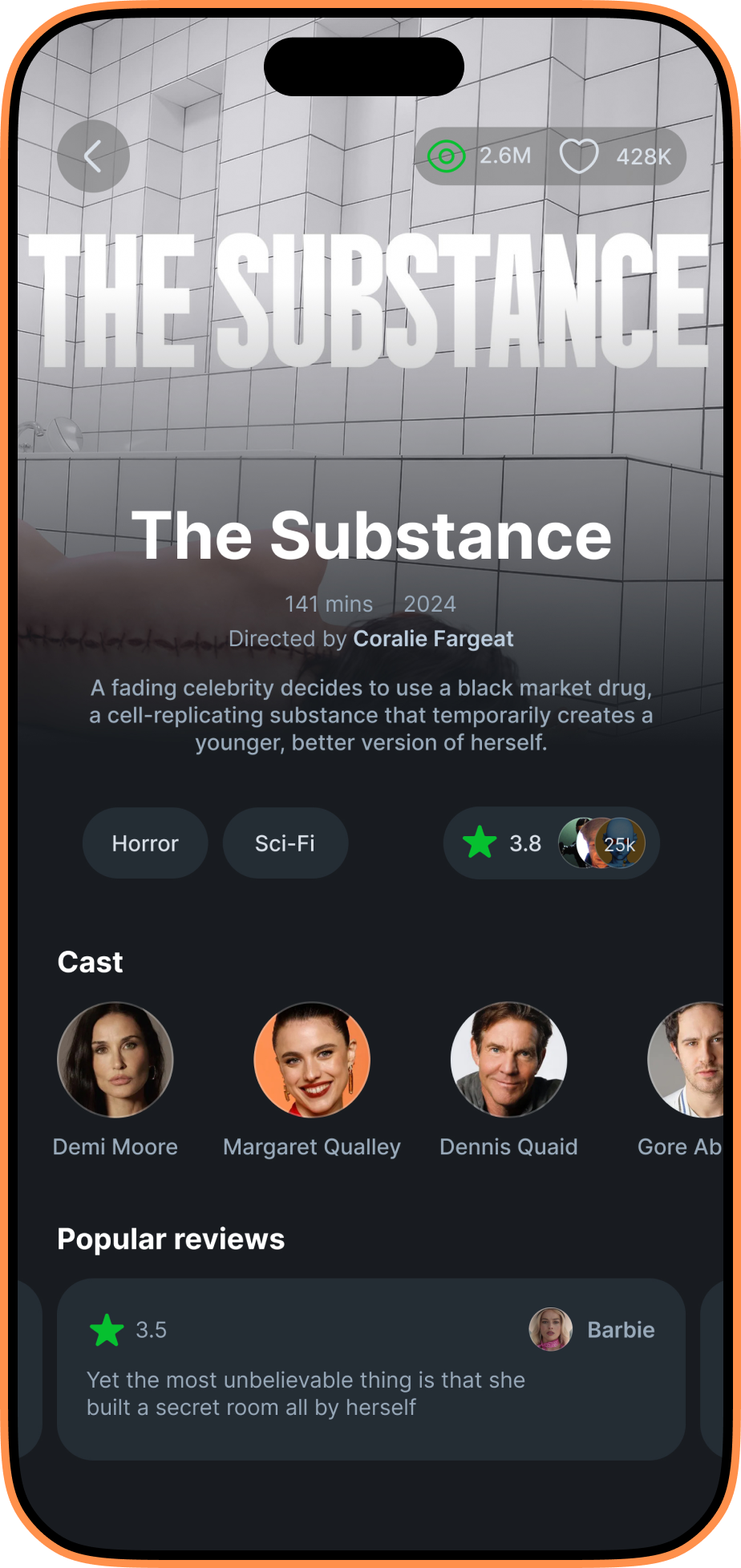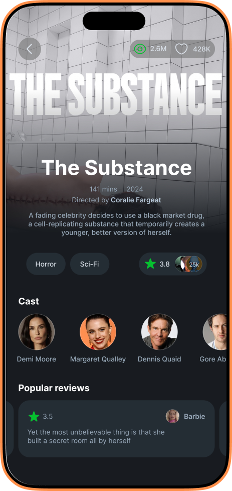 The Film Selection screen is the heart of the LetterMatchd experience. A single movie title is displayed at a time, focusing user attention and avoiding decision fatigue. Each film card includes a poster, genre tags, and a quick synopsis. Tapping the card expands it into a detailed view, featuring the cast and popular reviews.
