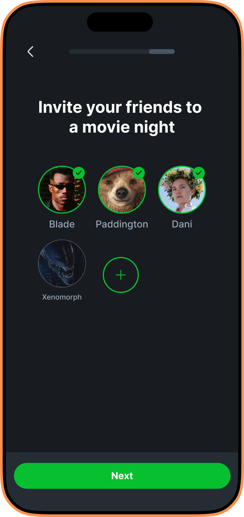 Friend avatars become highlighted with a green border and checkmark once they join the party lobby, creating real time feedback on readiness. Once all invited participants are marked as ready, you are ready to start selecting films.
