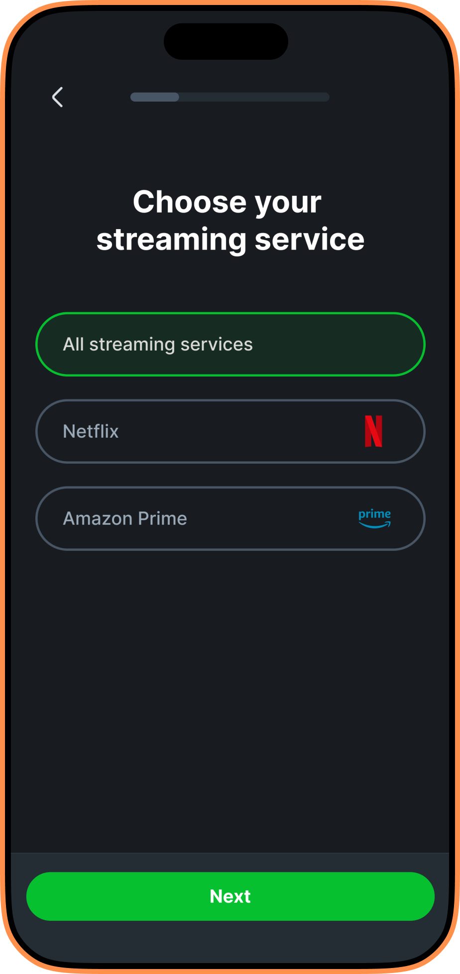 The first screen introduces streaming service selection, allowing users to filter by platforms they subscribe to. This ensures that recommended titles are always accessible. Selections are made via tappable buttons with familiar brand cues (e.g., the Netflix "N"), supporting quick cognitive recognition.