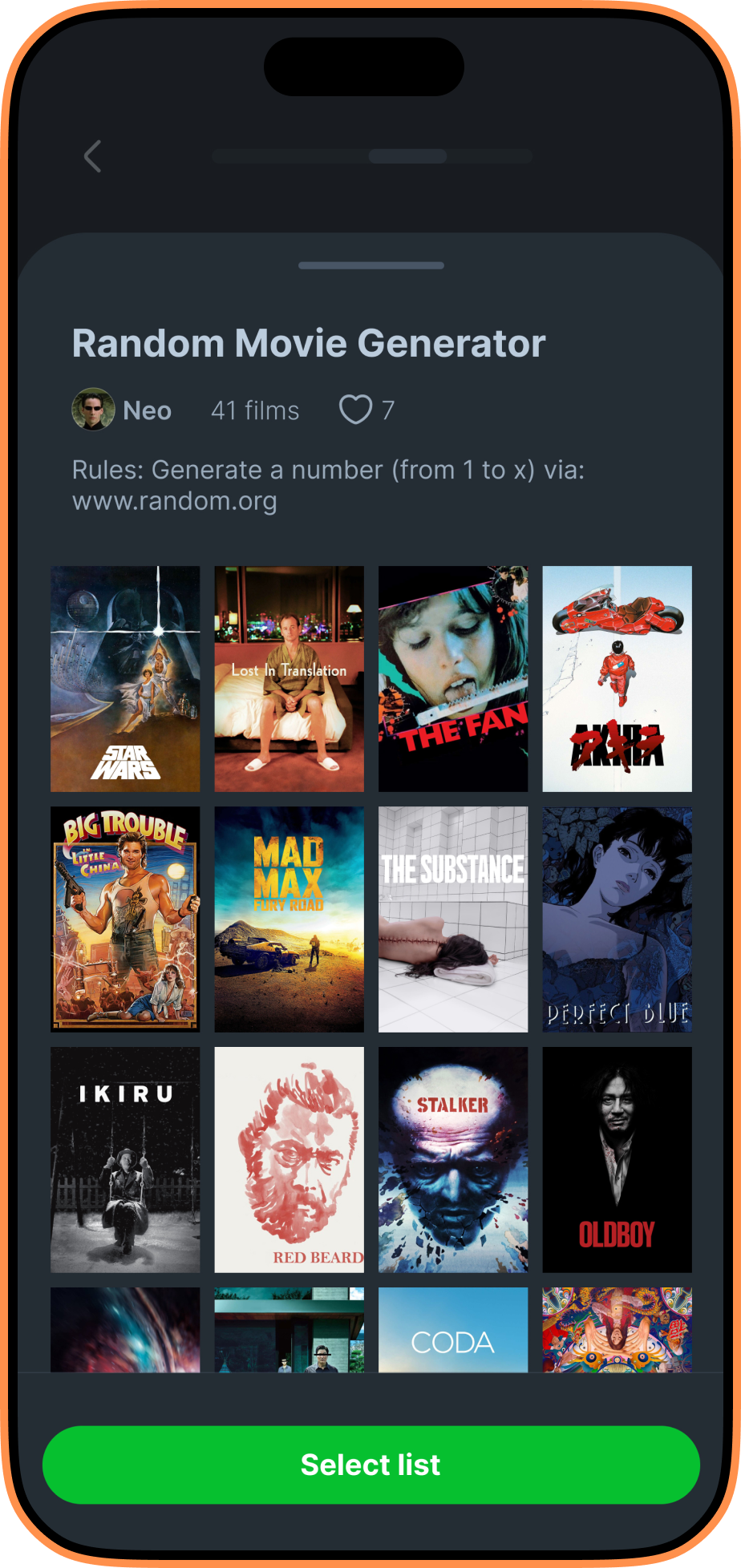 Selecting “Select from Lists” expands the interface to display available personal and community-curated Letterboxd lists. Tapping a list opens a brief detail view showing the number of films included and a preview of titles, helping users quickly assess suitability before confirming.