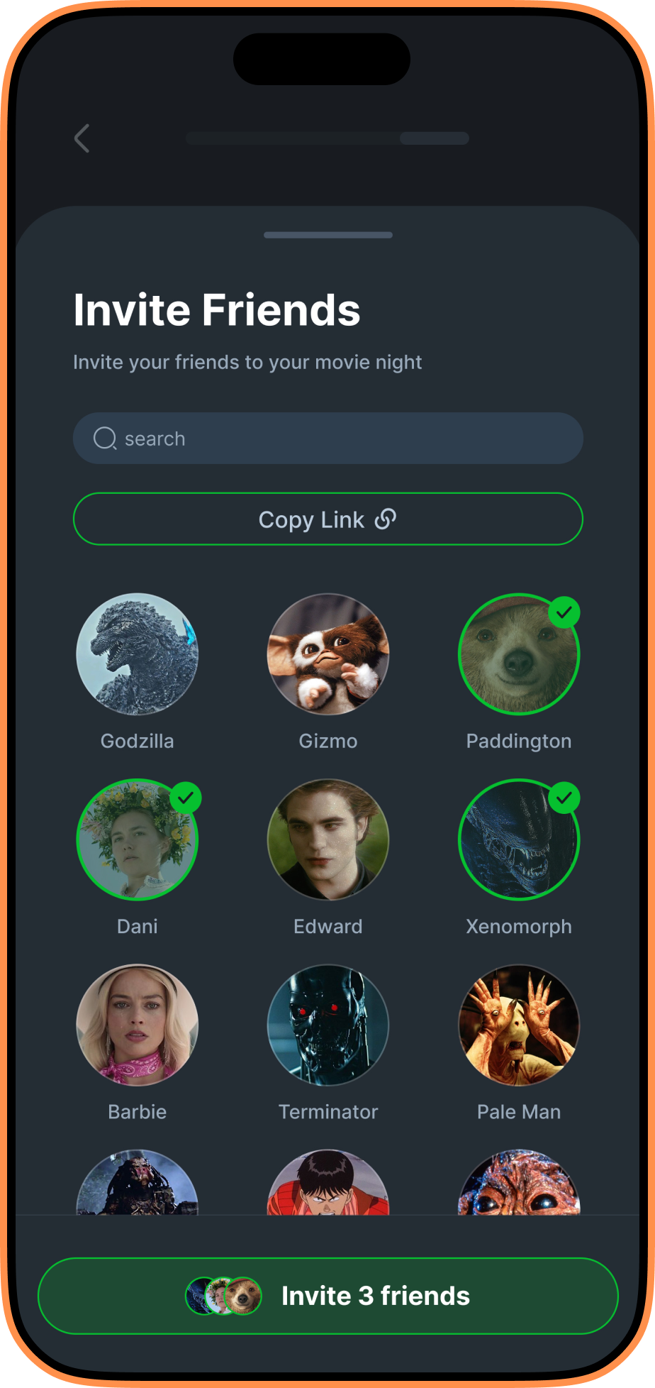 The Invite Friends panel is activated by tapping the plus icon in the group lobby interface. Once activated, the panel displays a grid of Letterboxd friends, enriched with search capabilities. Users can also copy and share a unique invite link externally.