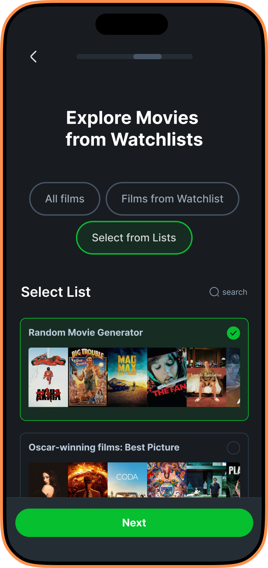 The Explore Movies from Watchlists screen allows users to define the pool of films used during the matching experience. Users can choose between All Films or limit results to Films from Watchlists, keeping the selection focused and relevant.