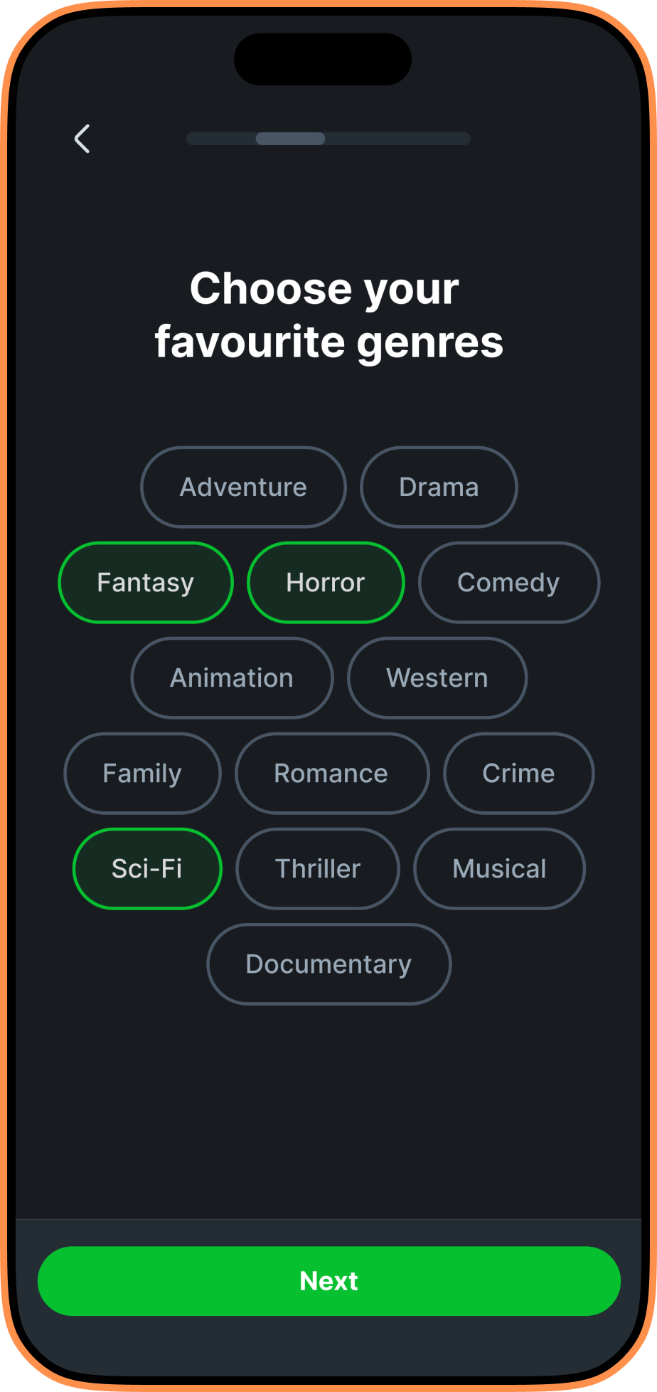 In the next step, users choose their favourite genres using pill-shaped tags. The UI leverages a visually balanced tag system with active/inactive states, helping users curate a viewing mood that reflects personal preferences.